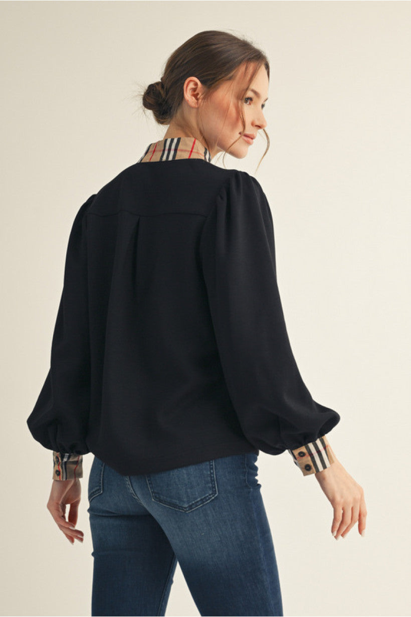 Elevate your look with this chic long puff sleeve top featuring a mock neckline and inspired plaid contrast accents. Designed with button closure cuffs for a sophisticated finish. A perfect blend of classic and trendy for effortless everyday style.